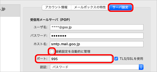 [受信用メールサーバ(POP)]の[接続設定を自動的に管理]のチェックを外し、[ポート]に 995 を入力します。