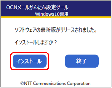 メールかんたん設定ツール(Windows10専用)の 旧バージョンをインストール済みのお客さまにおきましては、パソコン起動時にアップデート通知にてバージョンアップのご案内をさせていただきます。その際、「インストール」を選択し、更新をお願いいたします。