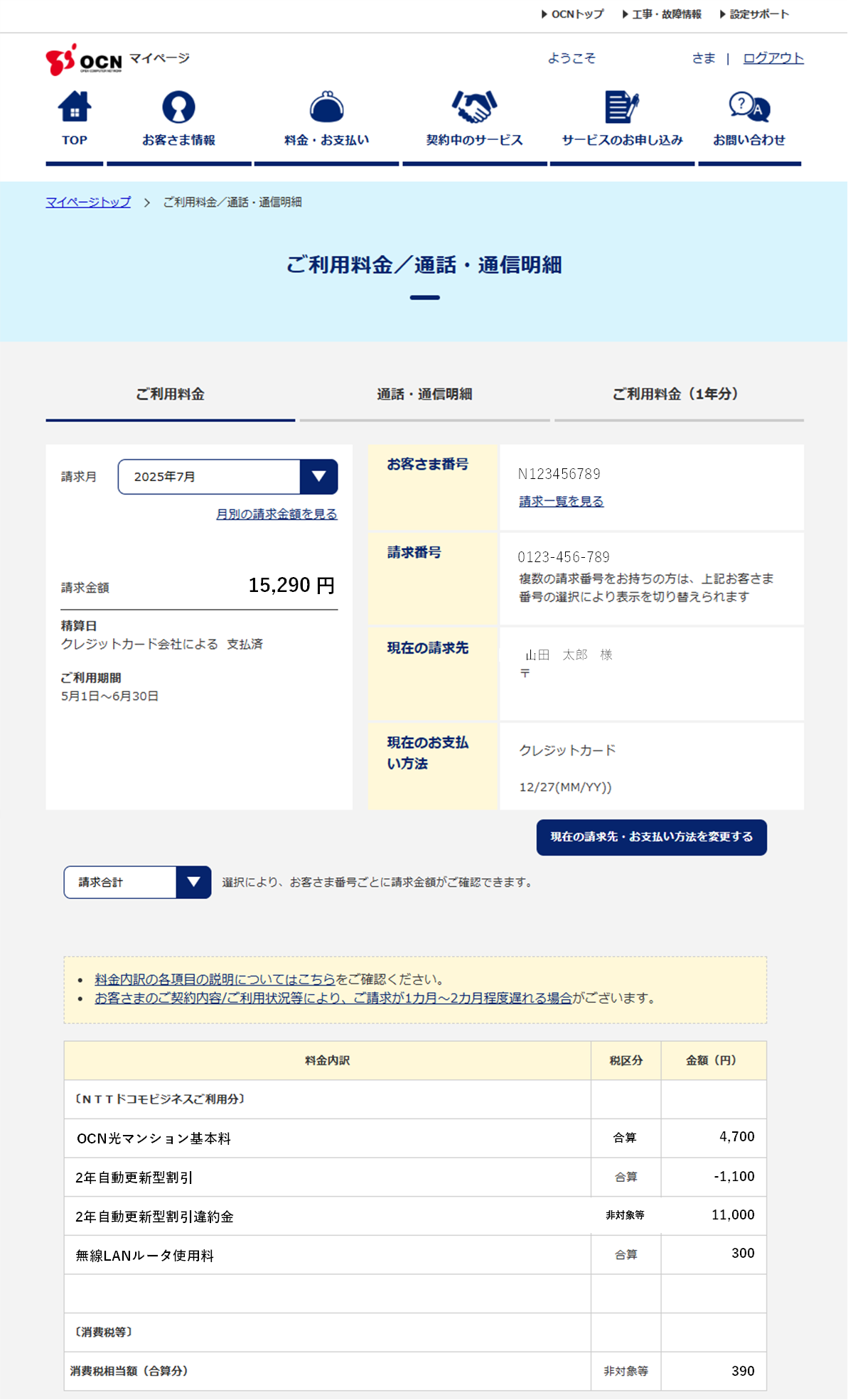 最終のご請求については、OCNマイページ内の「ご利用料金」ページ、または「オンライン領収証」からもご確認いただけます。